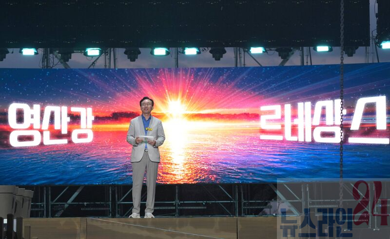 무선마이크를 착용하고 무대에 오른 윤병태 시장은 기념사를 하며 영산강정원의 미래와 올해 축제를 통해 나주가 한발짝 도약하는 새로운 영산강 르네상스 시대의 비전을 설명했다.