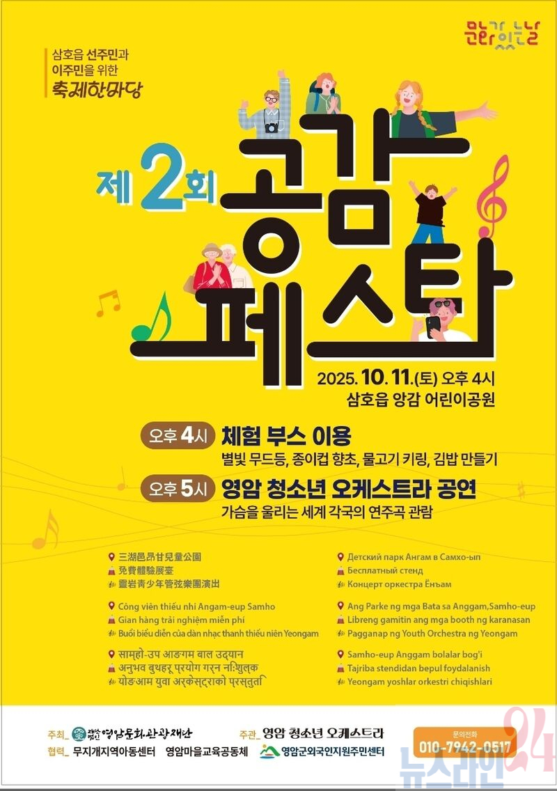 (재)영암문화관광재단과 영암청소년오케스트라는 문화가 있는날 행사지원 사업으로 2025년 10월 11일(토) 오후 4시 삼호읍 앙감 어린이 공원에서 ‘제2회 공감페스타’행사를 개최한다.