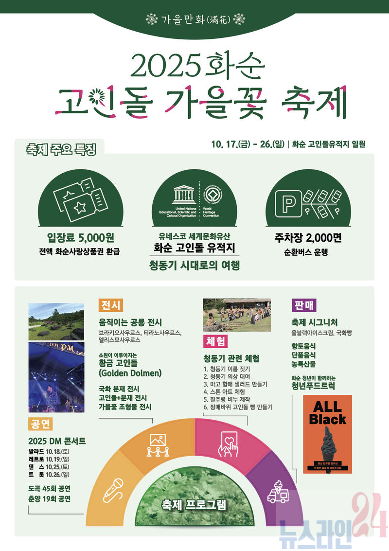 화순군(군수 구복규)이 '가을만화(滿花)'를 주제로 10월 17일부터 10월 26일까지 10일간 개최하는 「2025 화순 고인돌 가을꽃 축제」의 안전 관람 및 편의 증진을 위해 최선을 다하고 있다.