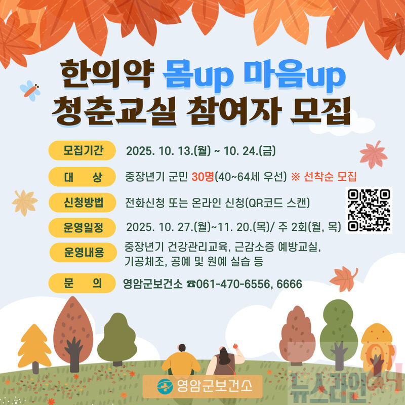 박수희 영암군보건소장은 “이번 청춘교실은 중·장년층이 건강한 노후를 준비하고 활기찬 삶을 이어갈 수 있도록 돕는 맞춤형 프로그램이다. 건강 생활을 실천할 영암군민의 많은 관심과 신청 바란다”고 전했다.