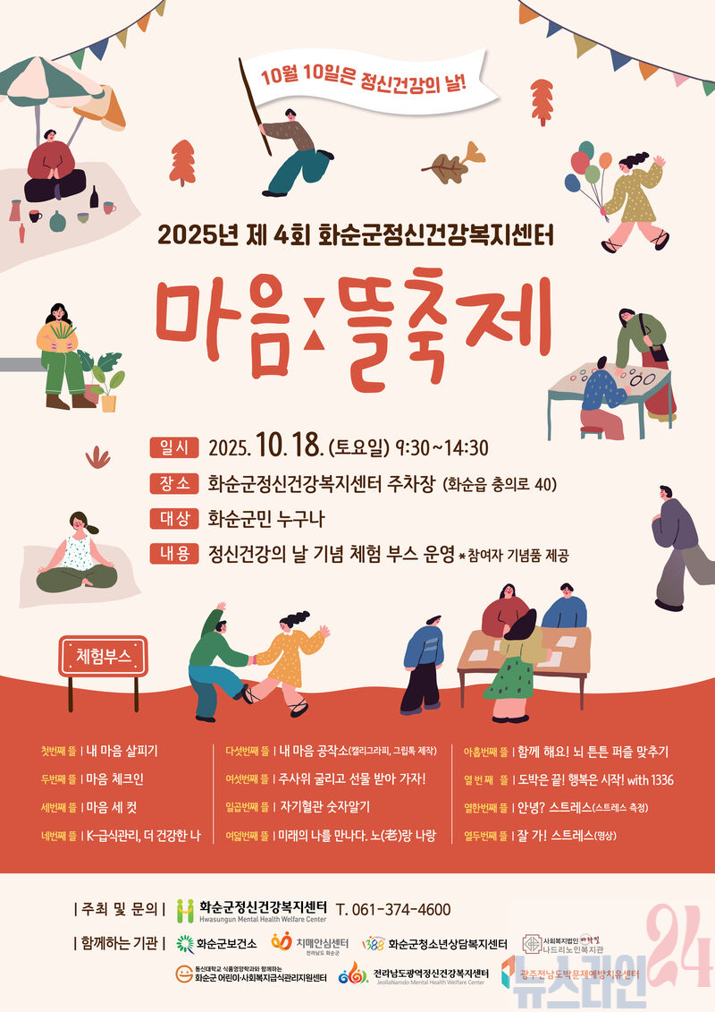 이번 축제는 화순군정신건강복지센터에서 10월 18일(토) 오전 9시 30분부터 오후 2시 30분까지 열리며, 지역 주민 누구나 무료로 참여할 수 있다.