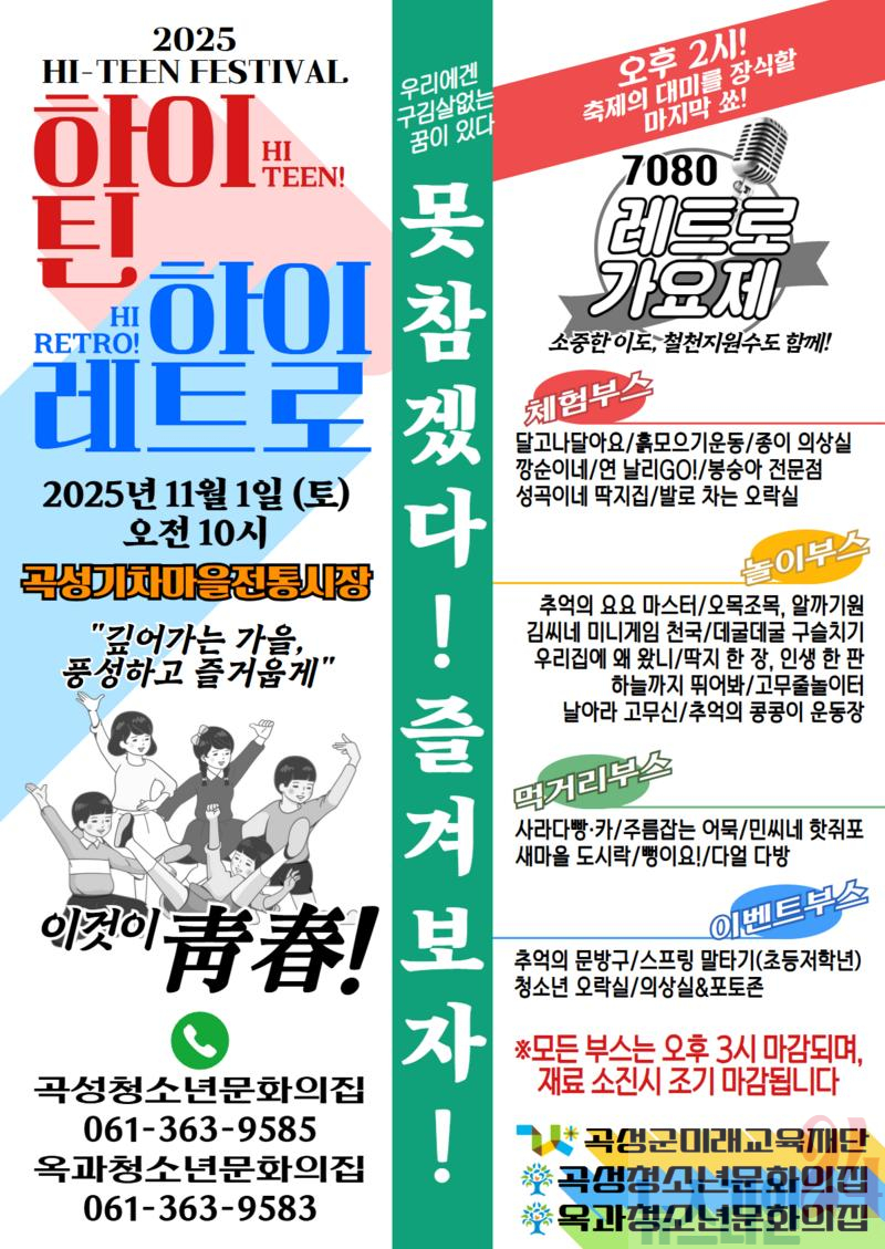 한편, 2025 곡성청소년 하이틴 페스티벌 ‘HI-TEEN, HI-RETRO’는 청소년들의 문화적 감성과 창의성을 표현할 수 있는 장으로, RETRO 가요제, 체험·놀이·먹거리·이벤트 부스 등 총 28개의 부스가 운영될 예정이다. 행사는 오는 11월 1일 곡성기차마을전통시장 일원에서 개최될 예정이다.