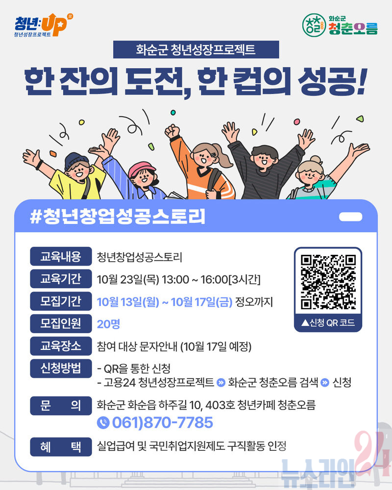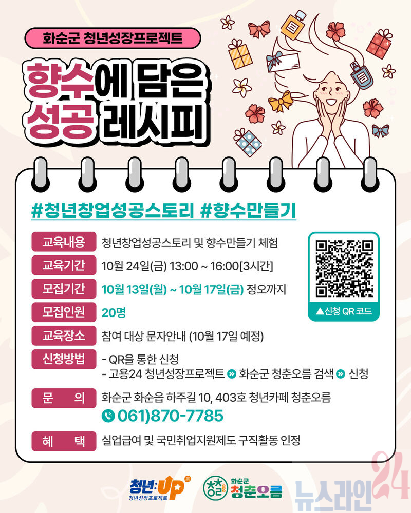 프로그램은 각각 2025년 10월 23일(목), 24일(금) 오후 13시부터 3시간 동안 진행되며, 장소는 참여자에게 개별 문자로 안내될 예정이다. 청년 누구나 신청이 가능하며, 선착순 20명 마감이다. 신청 방법은 포스터 QR코드 또는 고용24 → 청년성장프로젝트 → 화순군 청춘오름을 검색하여 신청할 수 있다.