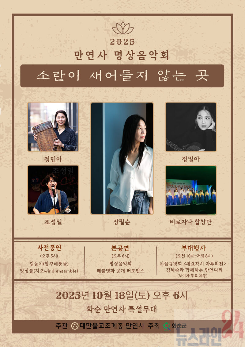 화순군(군수 구복규)은 오는 18일(토) 저녁 6시 ‘2025 만연사 산사음악회’가 만연사 특설무대에서 개최된다고 밝혔다.