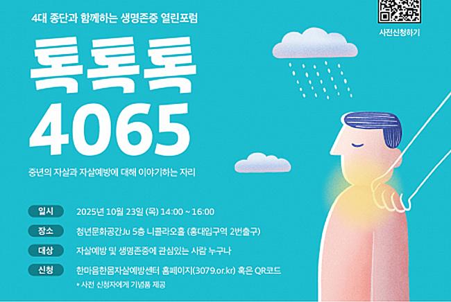 서울시자살예방센터가 2025년 살사프로젝트 열린포럼 ‘톡톡톡 4065’를 10월 23일(목) 14시에 청년문화공간JU 니콜라오 홀에서 개최한다.