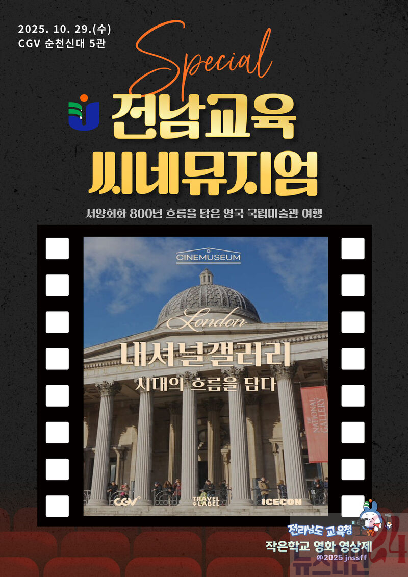 이 프로그램은 CJ CGV ICECON의 ‘씨네뮤지엄’을 전남교육청 맞춤형 인문학 교육 콘텐츠로 재구성한 것으로, ‘내셔널 갤러리, 시대의 흐름을 담다’라는 주제 아래 유럽 미술의 역사와 예술가들의 삶, 문화적 배경을 인문학적 시각으로 조명한다.
