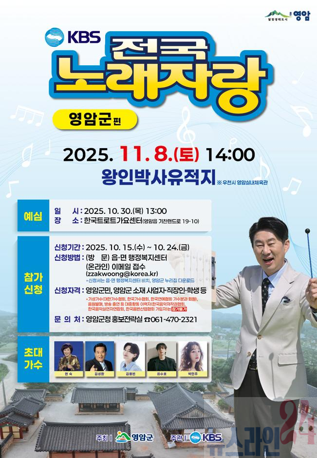 영암군 주최, KBS 주관으로 11/8일 오후 2시 왕인박사유적지에서 열리는 전국노래자랑에서 솜씨를 뽐낼 영암군민 등의 신청을 받는다.