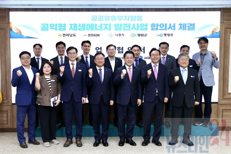 영암군(군수 우승희)이 15일 전남도청에서 전라남도, 나주시, 영광군, 한전KDN(주)과 ‘공공 유휴부지 활용 공익형 재생에너지 발전사업 업무협약’을 체결했다.