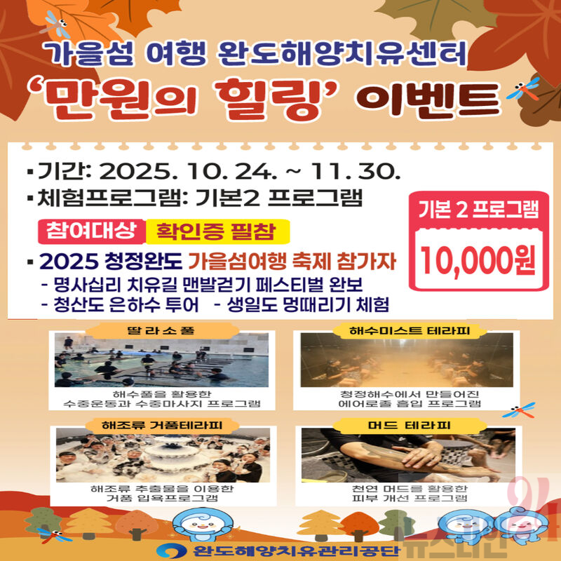 완도해양치유센터에서 10월 24일부터 26일까지 개최되는 ‘2025 청정 완도 가을 섬 여행’과 연계하여 ‘만원의 힐링’ 이벤트를 진행한다.