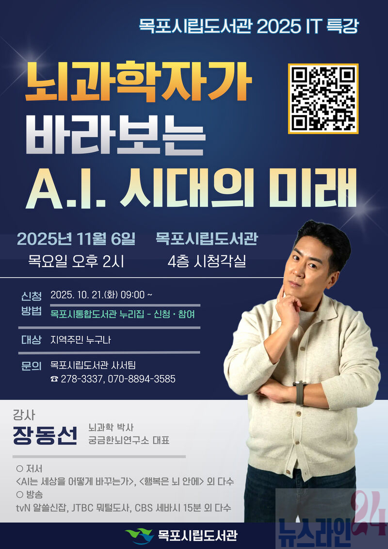 목포시립도서관(관장 최진수)은 오는 11월 6일 오후 2시, 급속히 확산되는 인공지능 시대에 발맞춰 지역 주민을 위한 특별 강연을 개최한다.