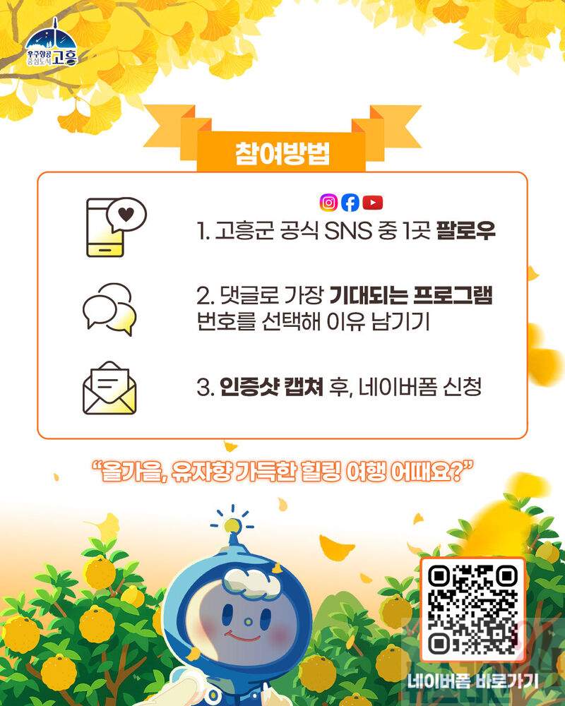 이벤트 참여 방법은 ①고흥군 공식 SNS(인스타그램, 페이스북, 유튜브) 중 1곳을 팔로우하고 ② 본 게시글 댓글에 제5회 고흥유자축제에서 가장 기대되는 프로그램 번호를 선택해 이유를 남긴 후 ③ 인증샷을 캡처 후, 네이버 폼 링크 이벤트 페이지에 접속해 간단한 신청서를 작성하면 된다.