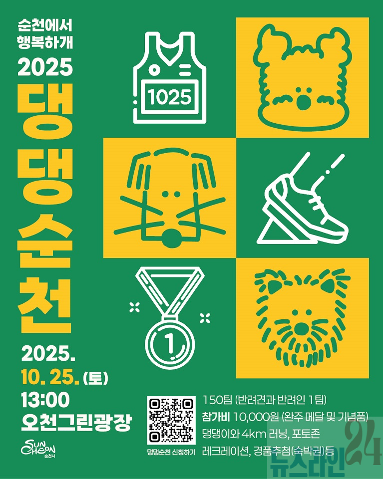 순천시(시장 노관규)는 오는 25일 오후 1시 오천그린광장 일원에서 반려견과 반려인이 함께 달리는 힐링 러닝축제 ‘2025 댕댕순천’을 개최한다.