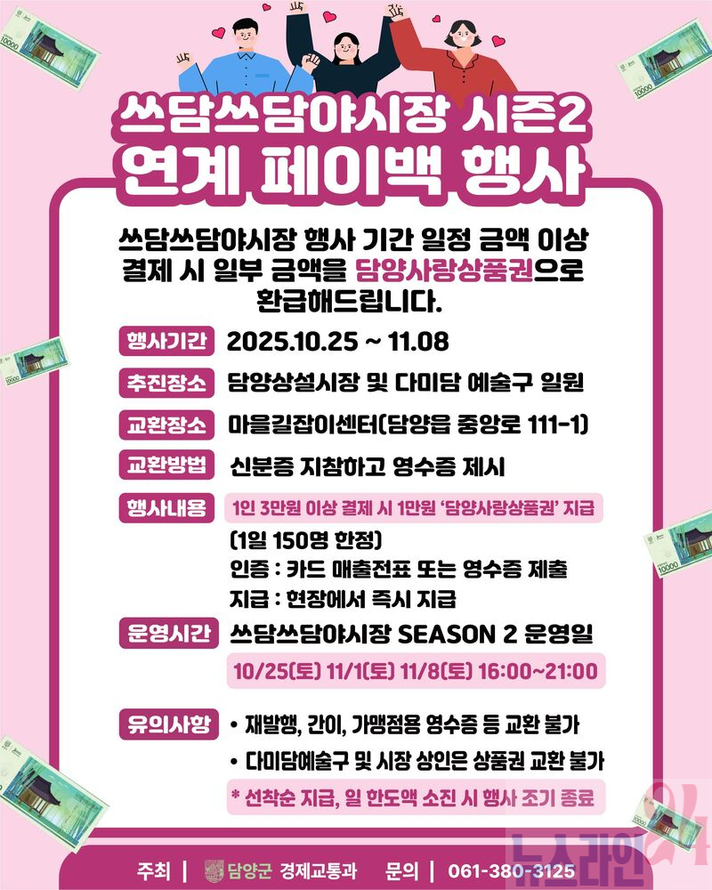 군은 야시장 기간 지역 소비 촉진과 상권 활성화를 위해 다미담예술구와 담양시장 내 현장 결제 고객을 대상으로 일정 금액을 담양사랑상품권으로 되돌려주는 ‘페이백 이벤트’를 진행한다.