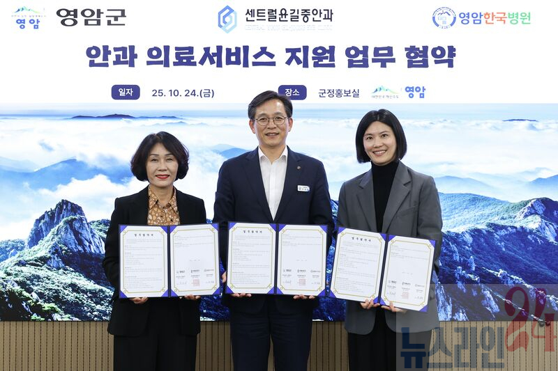 영암군(군수 우승희)이 24일 군청에서 센트럴윤길중안과, 영암한국병원과 ‘백내장 수술 지원 민관 협약식’을 체결했다.