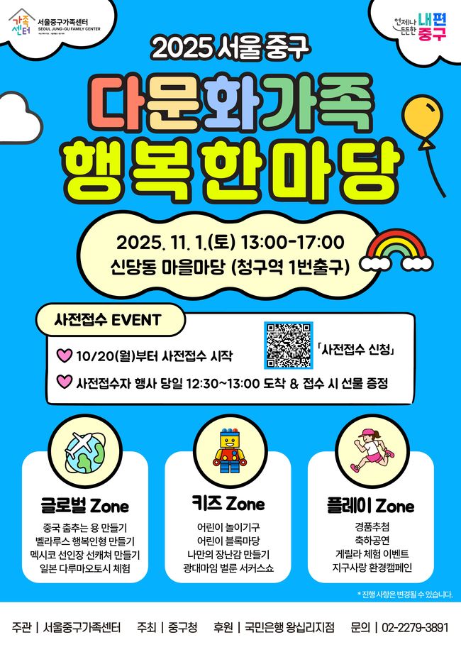 2025년 다문화가족 행복한마당 홍보 포스터.서울 중구는 오는 11월 1일 오후 1시부터 5시까지 신당동 마을마당(청구역 1번 출구 옆)에서 ‘다문화가족 행복한마당’을 개최한다고 밝혔다.