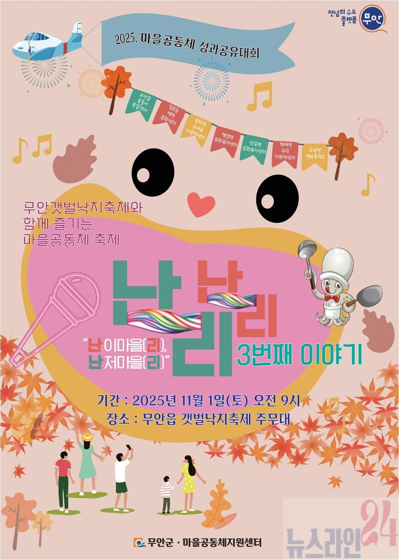 전남 무안군(군수 김산)은 11월 1일 무안읍 갯벌낙지축제 주무대에서 ‘난리난리 제3탄’을 2025년 무안군 일반농산어촌개발사업 성과발표회로 개최한다.
