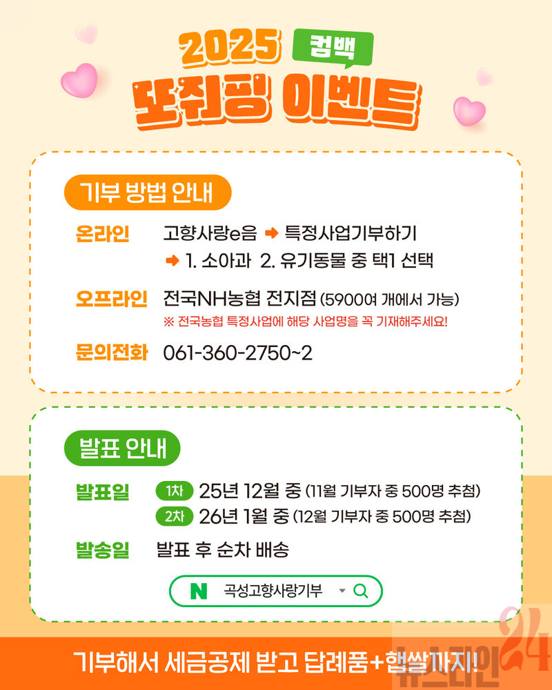 두 달 동안 10만 원 이상 기부자에 대해 매달 500명을 무작위 추첨해 1만 원 상당의 지역 쌀을 증정한다. 참여 방법은 고향사랑e음 또는 위기브 등 민간 플랫폼을 통해 곡성군에 기부하면 자동으로 응모되며, 당첨자는 개별 통보된다.