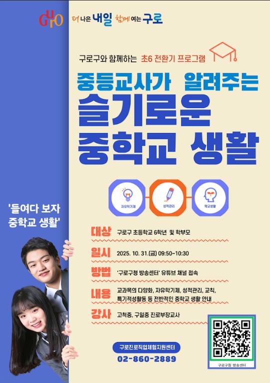 구로구 슬기로운 중학교 생활 홍보 포스터.서울 구로구(구청장 장인홍)는 10월 31일 오전 9시 50분부터 ‘슬기로운 중학교 생활’ 프로그램을 유튜브 생방송으로 진행한다고 밝혔다.