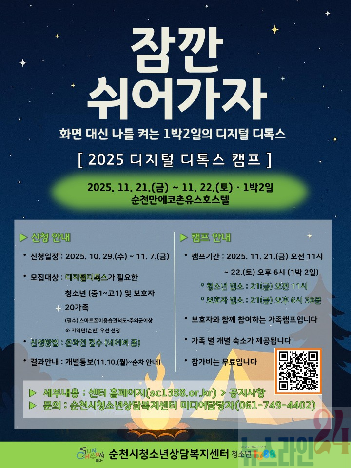 순천시(시장 노관규)는 청소년의 건강한 미디어 사용습관 형성과 가족 간 유대감 강화를 위해 「2025년 청소년 디지털 디톡스 캠프」를 오는 11월 21일부터 22일까지 순천만에코촌 유스호스텔에서 1박 2일 간 운영한다.