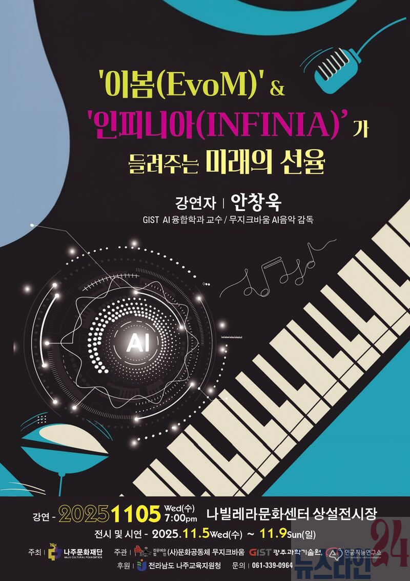 나주문화재단이 인공지능(AI)을 활용한 신개념 음악 프로젝트 ‘이봄(EvoM)·인피니아(INFINIA)가 들려주는 미래의 선율’을 오는 11월 5일 저녁 7시에 나빌레라문화센터에서 개최한다.
