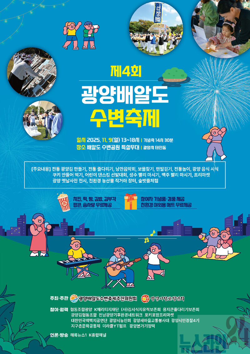 한편, 오는 11월 9일(일) 오후 1시, 배알도 수변공원 특설무대에서는 광양 전통 김 만들기, 보물찾기, 용지큰줄다리기 등 다채로운 체험이 펼쳐지는 ‘제4회 광양 배알도 수변축제’가 열린다.