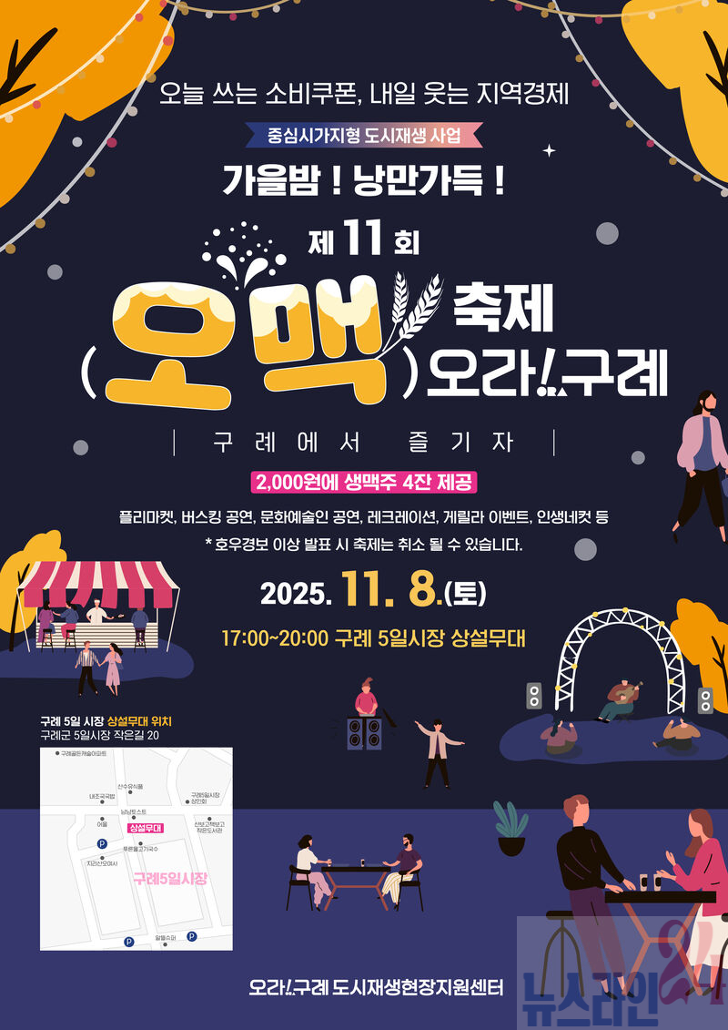 전남 구례군은 오는 11월 8일(토) 오후 5시부터 8시까지 구례읍 5일시장(상설무대) 일원에서 「가을밤! 낭만가득!! 제11회 오맥축제 오라!구례」를 개최한다고 밝혔다.