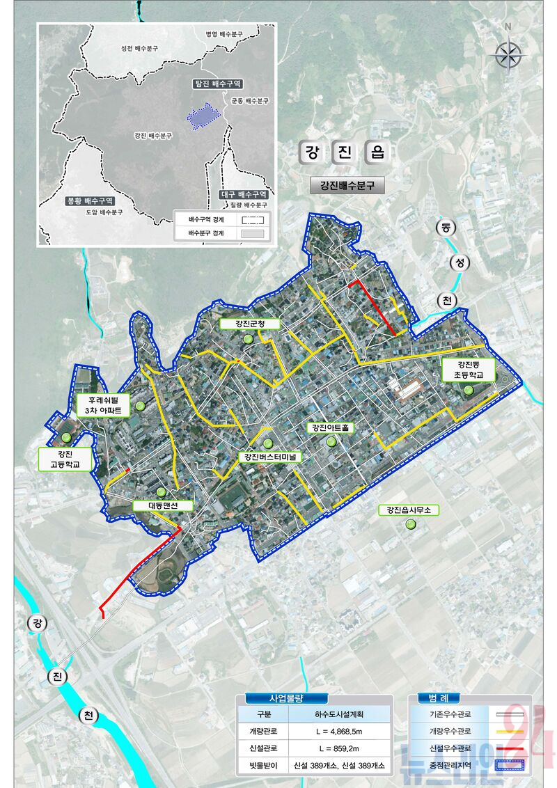 정비 대상지는 강진읍 강진배수분구(서성리, 남성리, 동성리, 평동리) 일원이며, 총사업비 360억 원(국비 216억 원)을 투입해, 우수관로 신설 및 개량 5.73km와 빗물받이 778개소(기존 개량 389개소, 신설 389개소)를 정비할 계획이다. 이를 통해 하수도 통수능력을 강화하고, 상습 침수 원인을 근본적으로 해결할 계획이다.