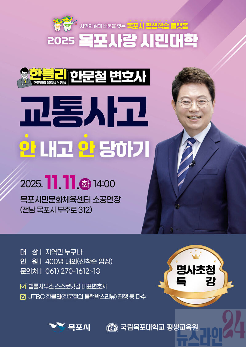 이번 강연은 목포시와 국립목포대학교가 공동 운영하는 「목포사랑 시민대학」 강좌의 일환으로 마련됐다. JTBC ‘한블리(한문철의 블랙박스 리뷰)’로 잘 알려진 한문철 변호사는 교통사고 처리 분야의 대표적인 전문가로, 실제 사고 영상과 판례를 통해 법적 책임 비율, 사고 대처 요령 등 일상에서 도움이 되는 교통법률 정보를 알기 쉽게 전할 예정이다.