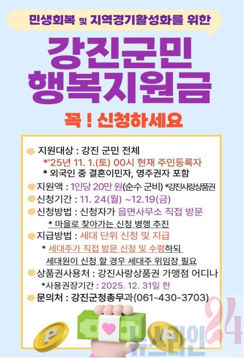 강진군 군민행복지원금은 오는 11월 24일부터 12월 19일까지 지급된다. 군민 1인당 20만 원씩 전액 지류형 강진사랑상품권으로 지급되며 온라인 신청 및 지급은 하지 않는다.