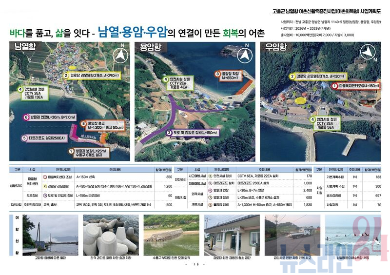 주요 사업으로는 방파제 연장 및 보강, 물양장 확장 및 증고, 도로 및 진입로 정비, 마을복지센터 조성 등이며, 어촌의 생활 인프라 확충과 안전성 강화를 위한 사업이 추진될 예정이다.
