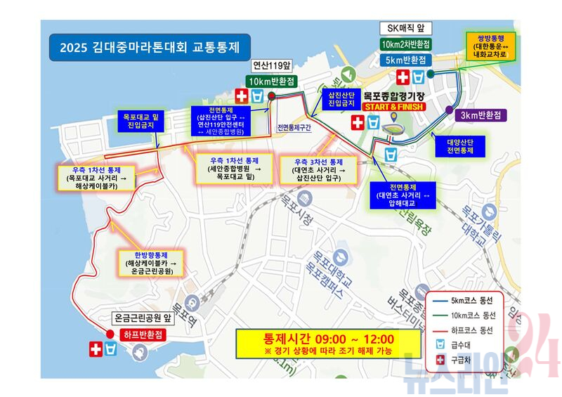 목포시는 오는 11월 23일(토) 오전 9시부터 12시까지 목포종합경기장 및 시 전역 일원에서 ‘2025 김대중 마라톤대회’가 개최됨에 따라 도로 일부 구간에 대해 교통통제를 실시한다고 밝혔다.