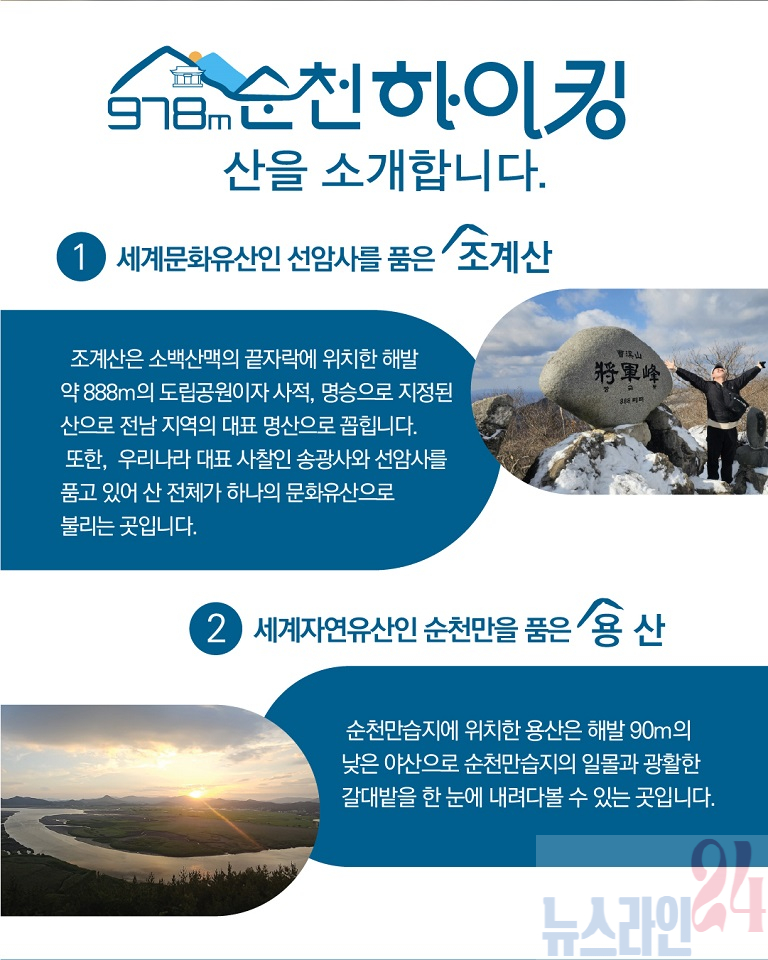 유네스코 세계유산 선암사와 세계자연유산 순천만습지를 연결하는 생태하이킹 챌린지로 조계산(888m)에서 용산전망대(90m)까지 총 978m의 상징적 고도를 따라, 순천의 자연과 문화, 그리고 사람을 하나의 여정으로 엮는다.