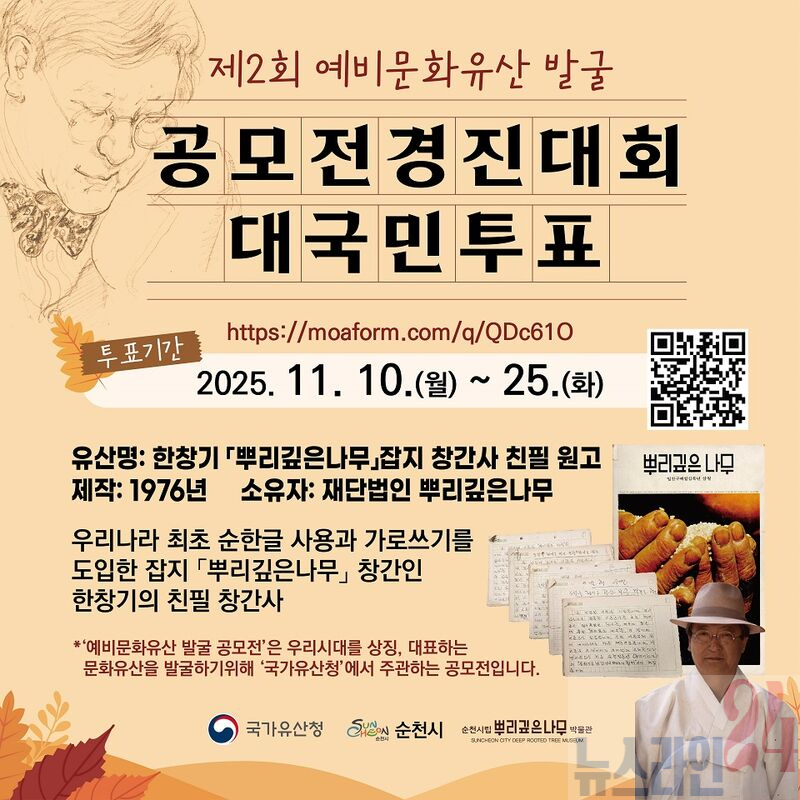 순천시(시장 노관규)와 뿌리깊은나무재단(이사장 차정금)은 순천뿌리깊은나무박물관에서 소장하고 있는 故한창기 선생의 「뿌리깊은나무」 잡지 창간사 친필원고가 국가유산청 주관 ‘제2회 예비문화유산 발굴 공모전’ 최종 후보에 선정됐다고 밝혔다.