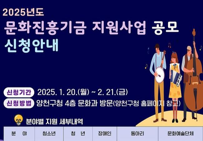 신청 자격은 공고일(1월 20일) 기준 1년 이상 양천구에 주소를 두고 문화예술분야 활동 실적이 2건 이상인 개인과 단체로, 지원 분야별 1개 사업만 신청할 수 있다. 신청을 희망할 경우 구청 홈페이지를 참고해 관련 서류를 작성한 후 이달 21일까지 구청 문화과로 방문 제출하면 된다.