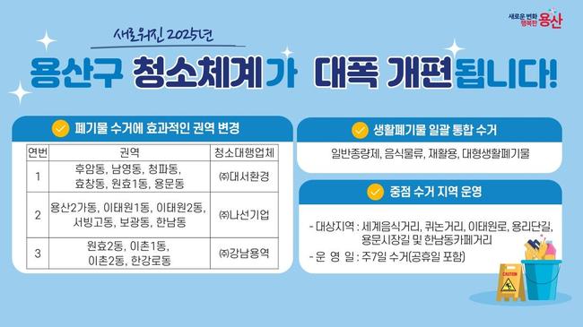 서울 용산구(구청장 박희영)가 주민 편의와 청소 효율성을 고려해 청소체계를 대폭 개선했다. 쓰레기 미수거, 이면도로 청소 방치 등 청소 불편사항을 최소화하기 위해서다.