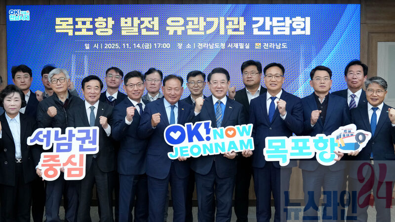 김영록 전라남도지사가 14일 도청 서재필실에서 열린 ‘목포항 발전 유관기관 간담회’에서 참석자들과 기념촬영을 하고 있다.