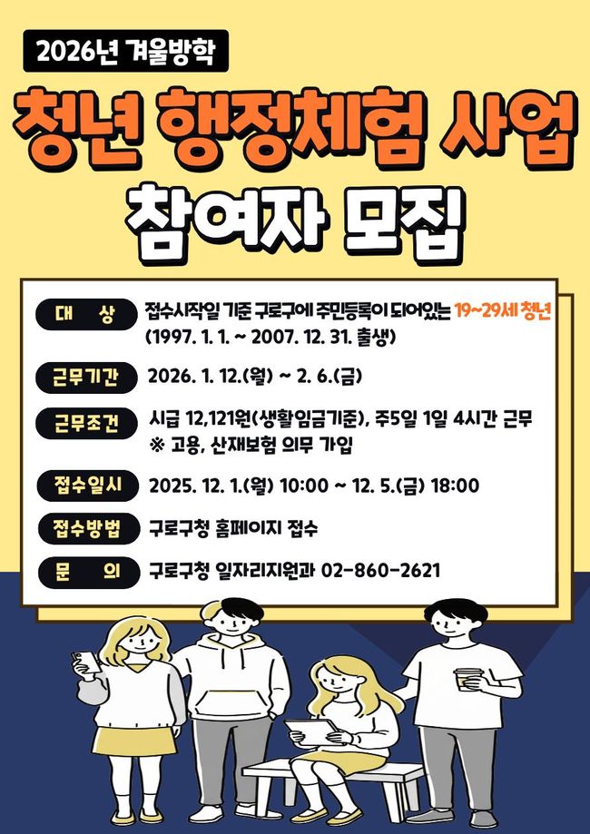 구로구 2026년 겨울방학 청년 행정체험 사업 홍보 포스터.구로구(구청장 장인홍)는 2026년 겨울방학을 맞아 청년 행정체험 사업 참여자를 모집한다고 18일 밝혔다.