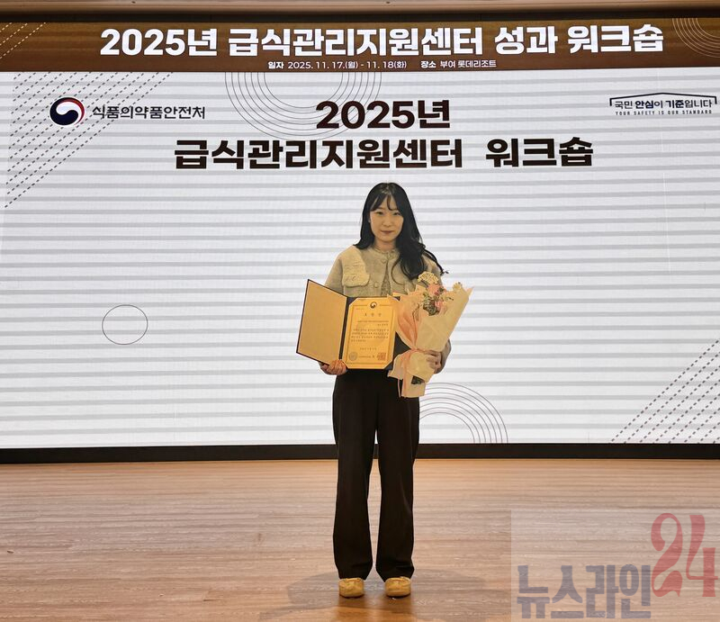 화순군(군수 구복규)은 위탁 운영하는 화순군 어린이·사회복지급식관리지원센터(센터장 나안희) 윤아현 팀장이 지난 11월 17일 식품의약품안전처가 주최한 2025년 급식관리지원센터 워크숍에서 급식 안전관리 유공자로 선정돼 식품의약품안전처장 표창을 받았다고 밝혔다.