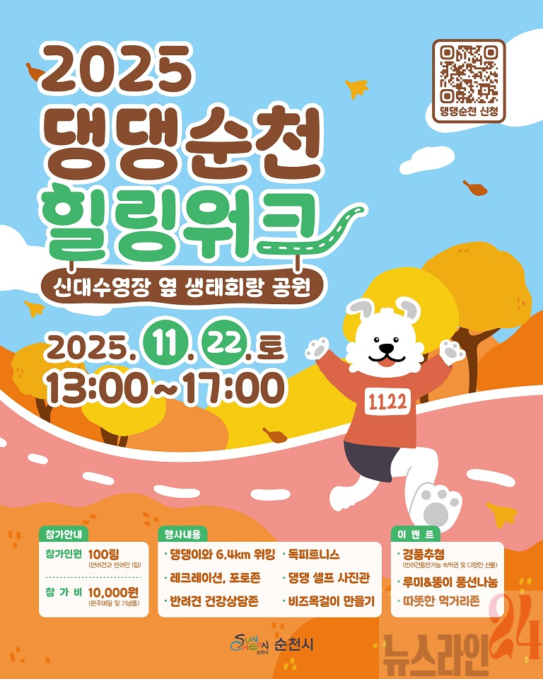 순천시(시장 노관규)는 오는 22일(토) 오후 1시 신대지구 생태회랑 일원에서 반려견과 함께 가을 산책을 즐기는 ‘2025 댕댕순천, 힐링워크’를 개최한다.