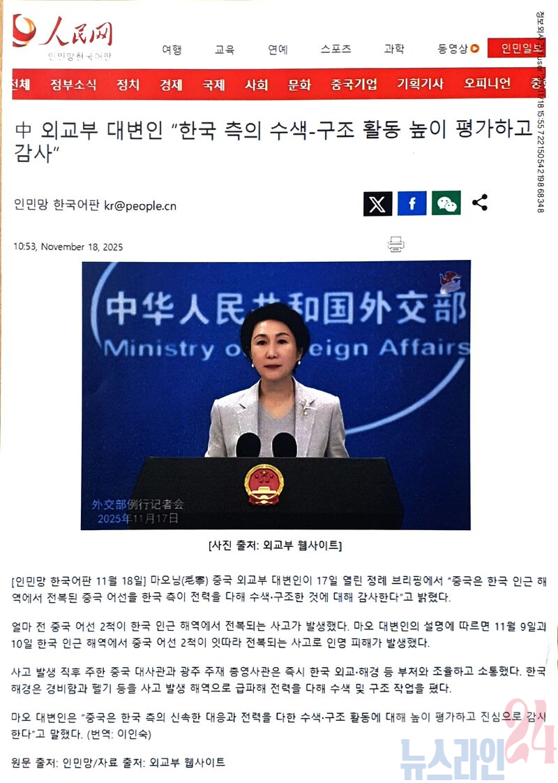 中 외교부, 서해해경 구조 활동에 진심어린 감사 표명 中, 주광주총영사관·농업농촌부·해경국 등 총 4차례 감사의 뜻 전해