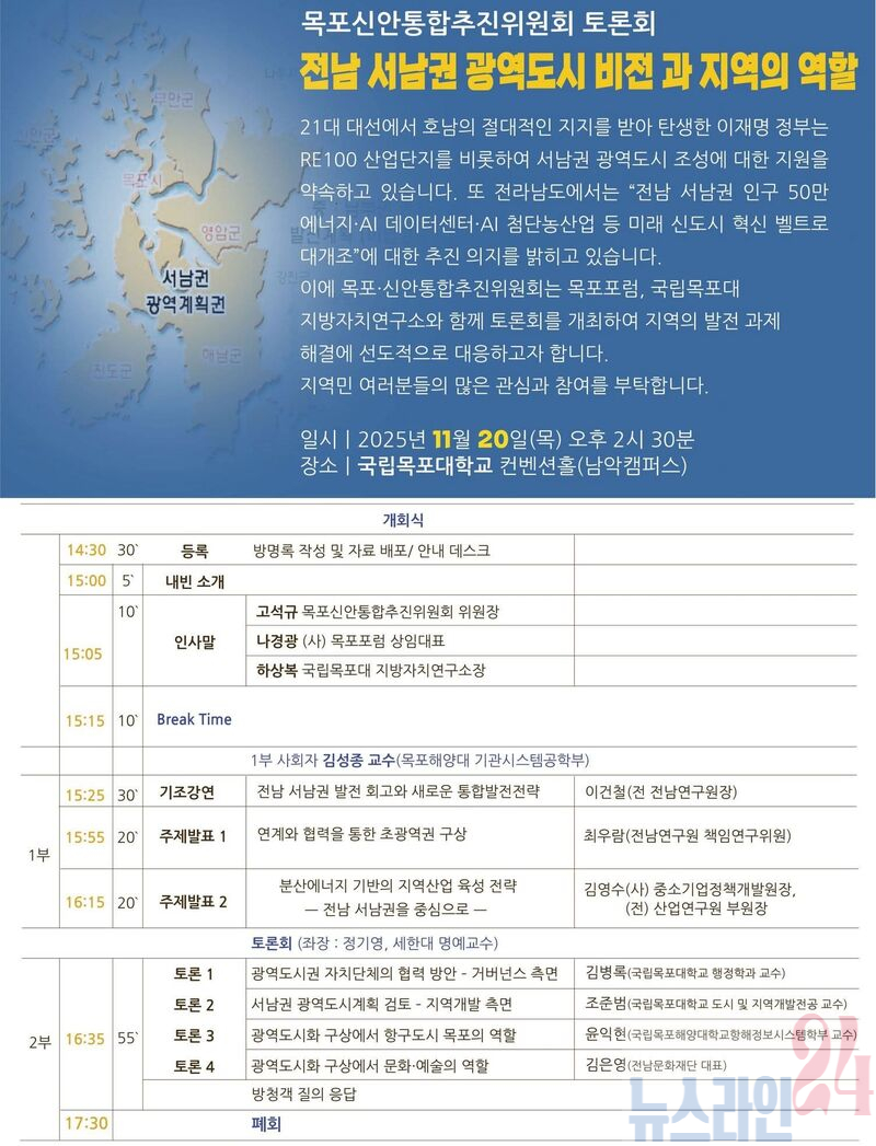 목포시는 목포신안통합추진위원회(위원장 고석규)가 주최하는 ‘전남 서남권 광역도시 비전과 지역의 역할 토론회’가 오는 20일 오후 2시 30분, 국립목포대학교 남악캠퍼스 컨벤션홀에서 개최된다고 밝혔다.