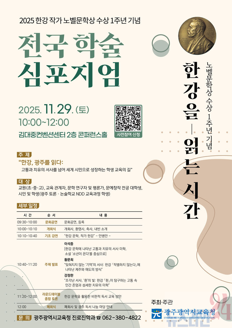 광주시교육청(교육감 이정선)은 오는 29일 오전 10시 서구 김대중컨벤션센터 콘퍼런스홀에서 한강 작가의 노벨문학상 수상 1주년을 기념하는 ‘전국 학술 심포지엄’을 개최한다.