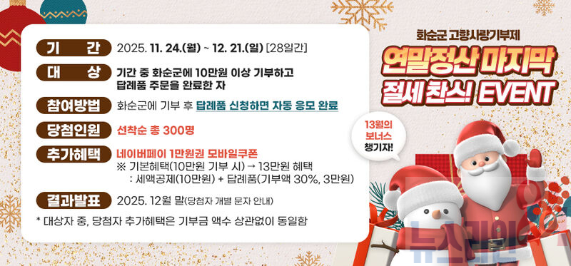 화순군(군수 구복규)은 연말을 맞아 고향사랑기부제 ‘연말정산 마지막 절세 찬스!’ 이벤트를 오는 11월 24일부터 12월 21일까지(28일간) 진행한다고 밝혔다.