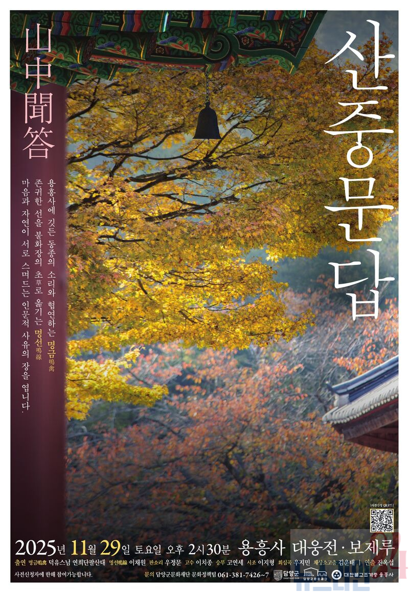 담양군문화재단(이사장 정철원, 이하 재단)은 오는 11월 29일 토요일 오후 2시 30분, 담양 월산면 용흥사에서 담양 인문콘서트 '산중문답(山中聞答)'을 개최한다고 밝혔다.