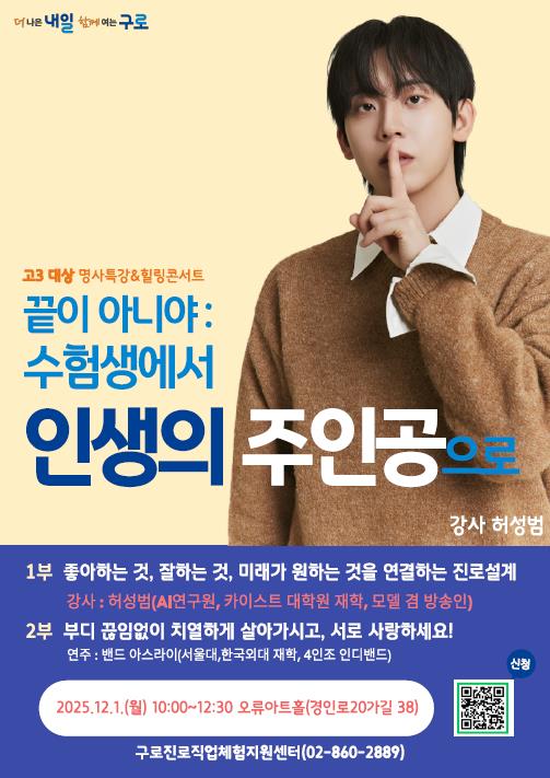 구로구, 수능 마친 고3 위한 ‘전환기 프로그램’ 운영 12월 1일 오류아트홀 개최…고3 학생 350명 참여 진로 설계 특강과 인디밴드 공연 등 2부 구성 정서 안정·자기주도 진로 탐색 지원 취지