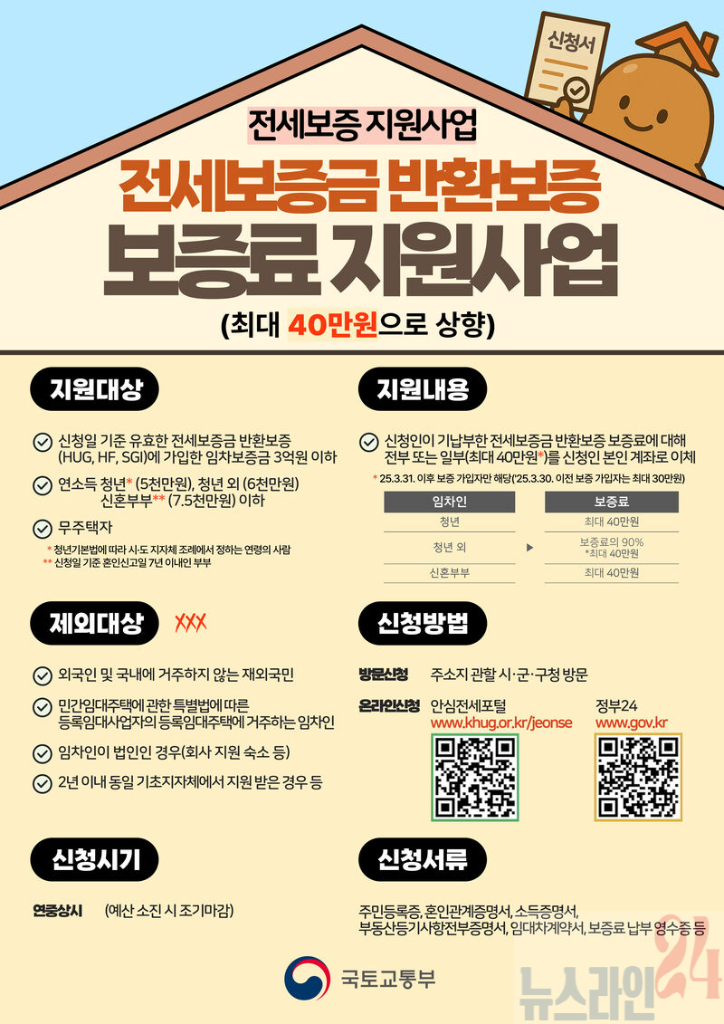 군 관계자는 “군민들의 안정적인 주거환경 조성을 위해 전세보증금반환보증 보증료 지원사업을 추진하고 있다”라며 “적극적인 홍보로 보증보험가입 활성화를 유도하여 전세사기 예방에 최선을 다하겠다“라고 말했다.