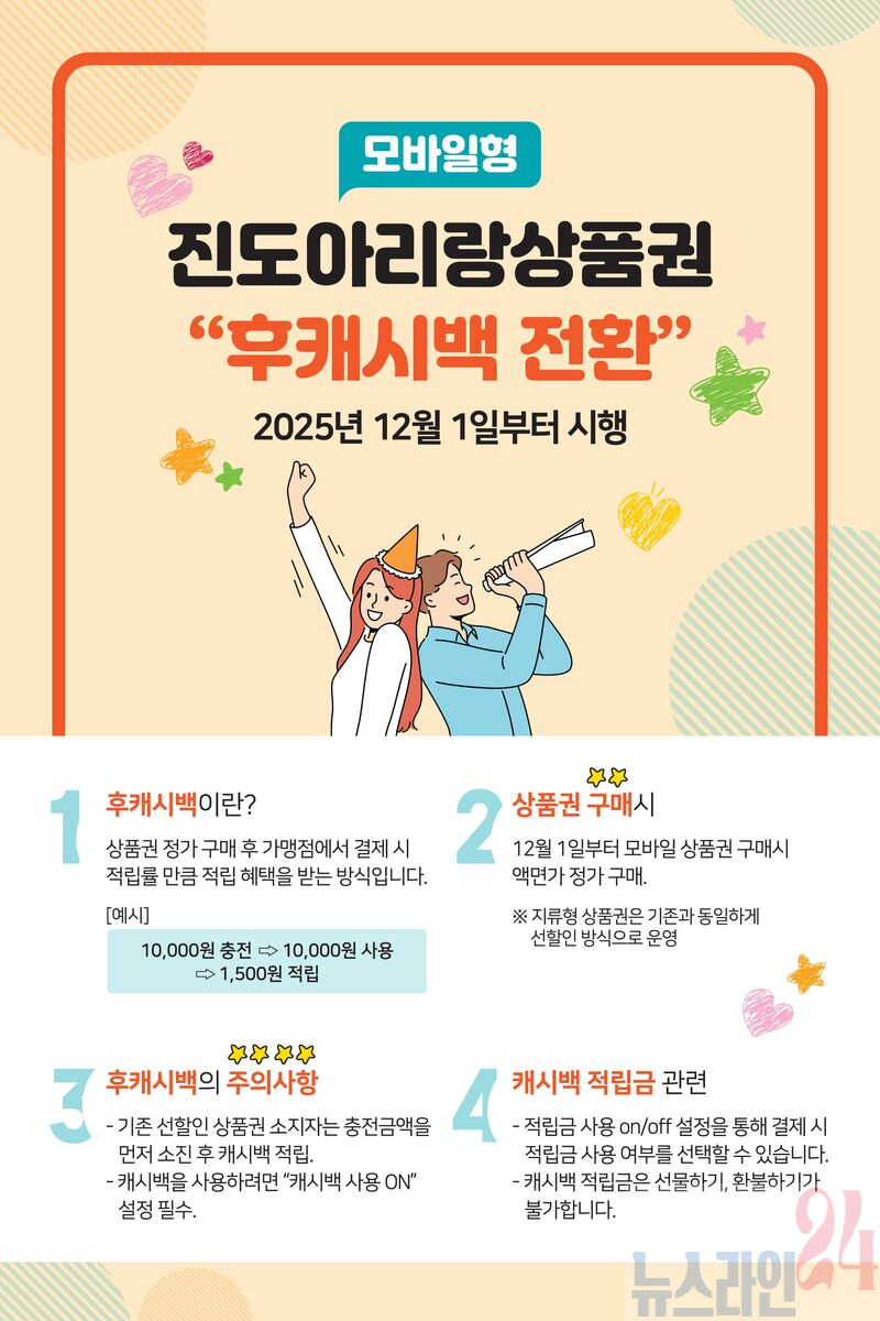 진도군은 오는 12월 1일부터 카드와 모바일형 진도아리랑상품권의 판매 방식을 ‘후적립(후캐시백)’ 방식으로 전환한다.