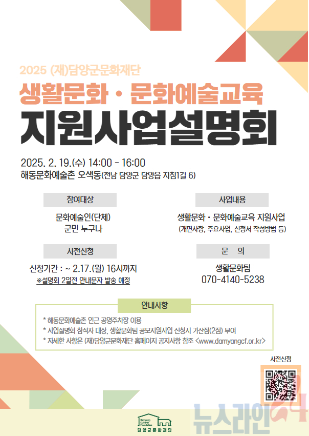 (재)담양군문화재단, 2025 생활문화·문화예술교육지원사업 설명회 개최 2월 19일 오후 2시, 해동문화예술촌 오색동에서 추진 사업 설명