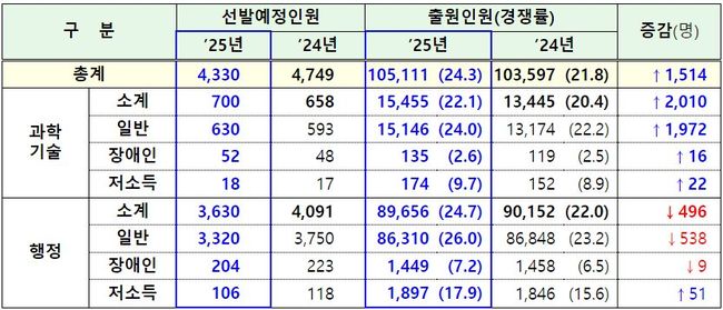 국가공무원 9급 공채 경쟁률 반등… 24.3대 1 기록 지난해 21.8대 1에서 상승… 처우 개선·공직 문화 혁신 효과 4,330명 선발에 10만 5,111명 지원… 응시자 수 1.5% 증가 행정직(교육행정) 363.8대 1 최고 경쟁률… 평균 연령 30.8세
