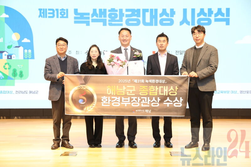 해남군이 9일 광주은행과 전남일보가 공동 주최한31회 녹색환경대상시상식에서 종합대상인 환경부장관상을 수상했다이번 수상은 지역 환경보전과 지속가능한 친환경 정책 추진에 대한 높은 평가를 받은 결과로해남군의 환경행정 역량을 다시 한번 입증한 것으로 평가된다.